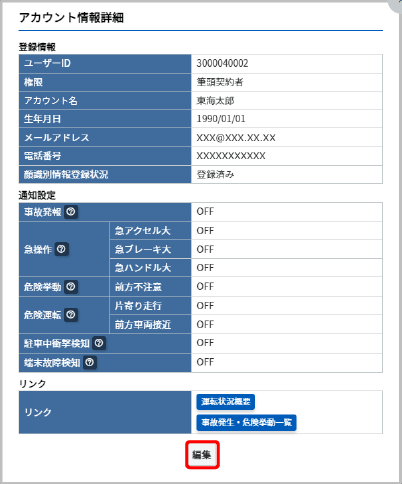 アカウント情報詳細画面(アカウント情報詳細画面を表示する)で【編集】をクリックします。