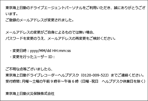 メールアドレスを変更・削除した場合、変更元・削除元のメールアドレスに通知メールが送信されます。 <変更した場合のメールの例>