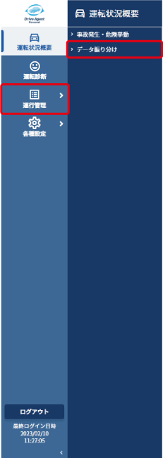 左メニューの【運行管理】の中の【データ振り分け】をクリックします。