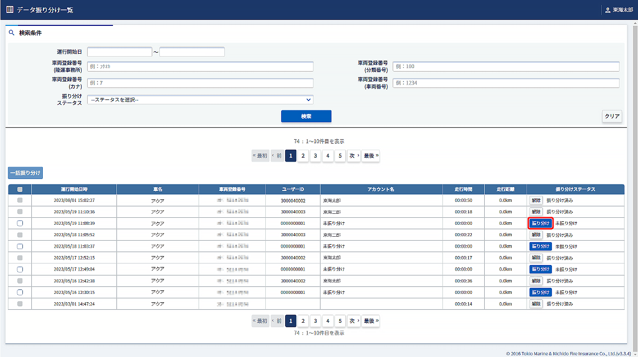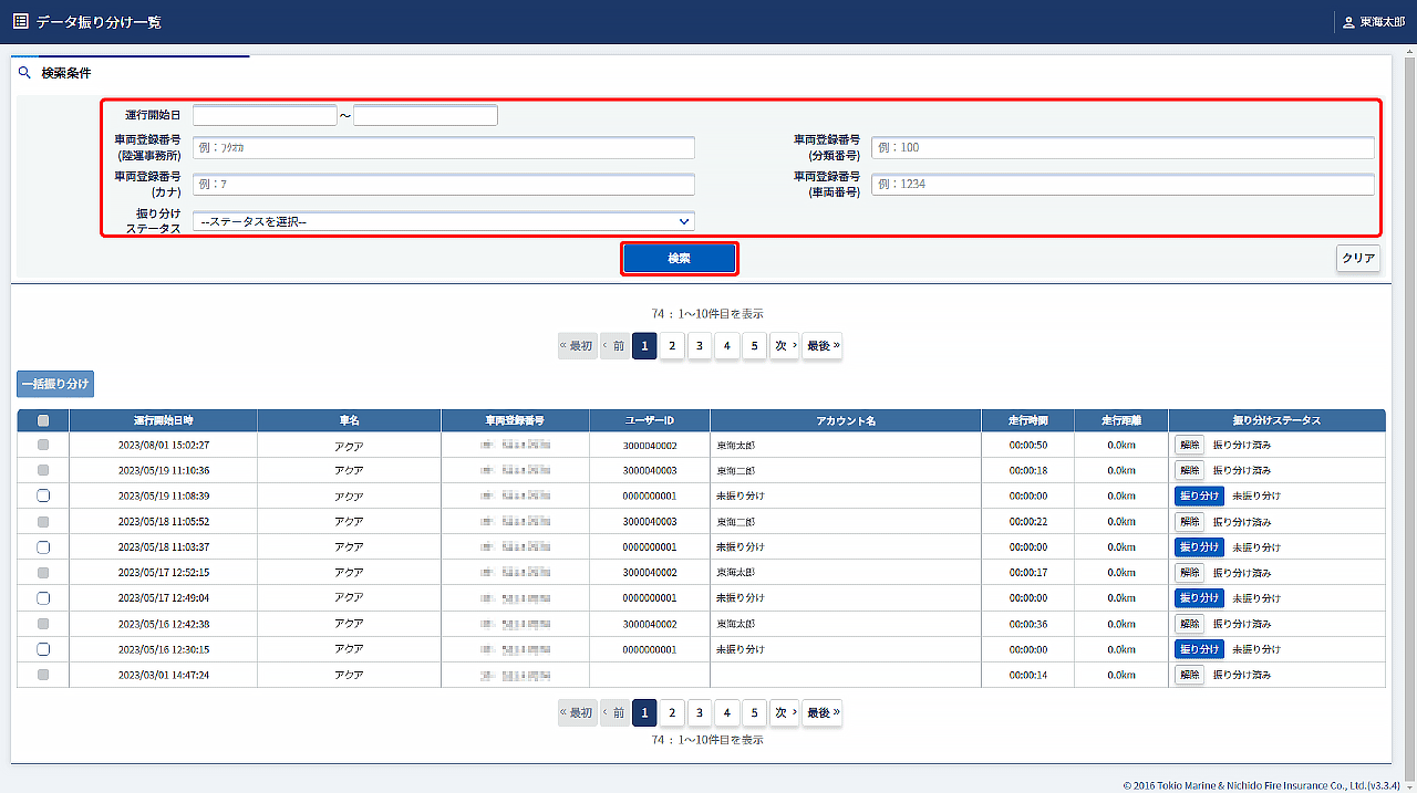 データ振り分け一覧画面で、検索条件を入力して【検索】をクリックし、振り分けたいデータを表示します。
