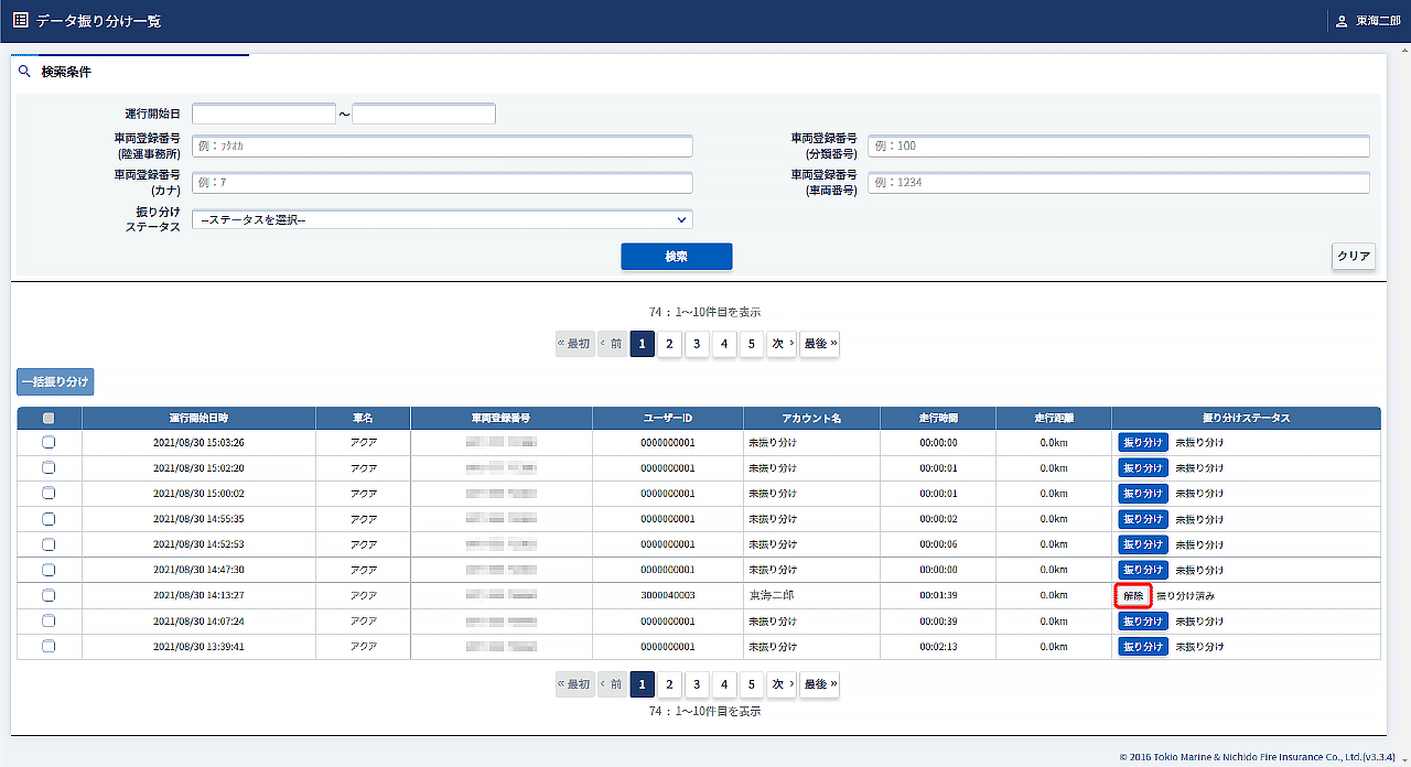 データ振り分け一覧画面で、検索条件を入力して【検索】をクリックし、解除したいデータを表示します。