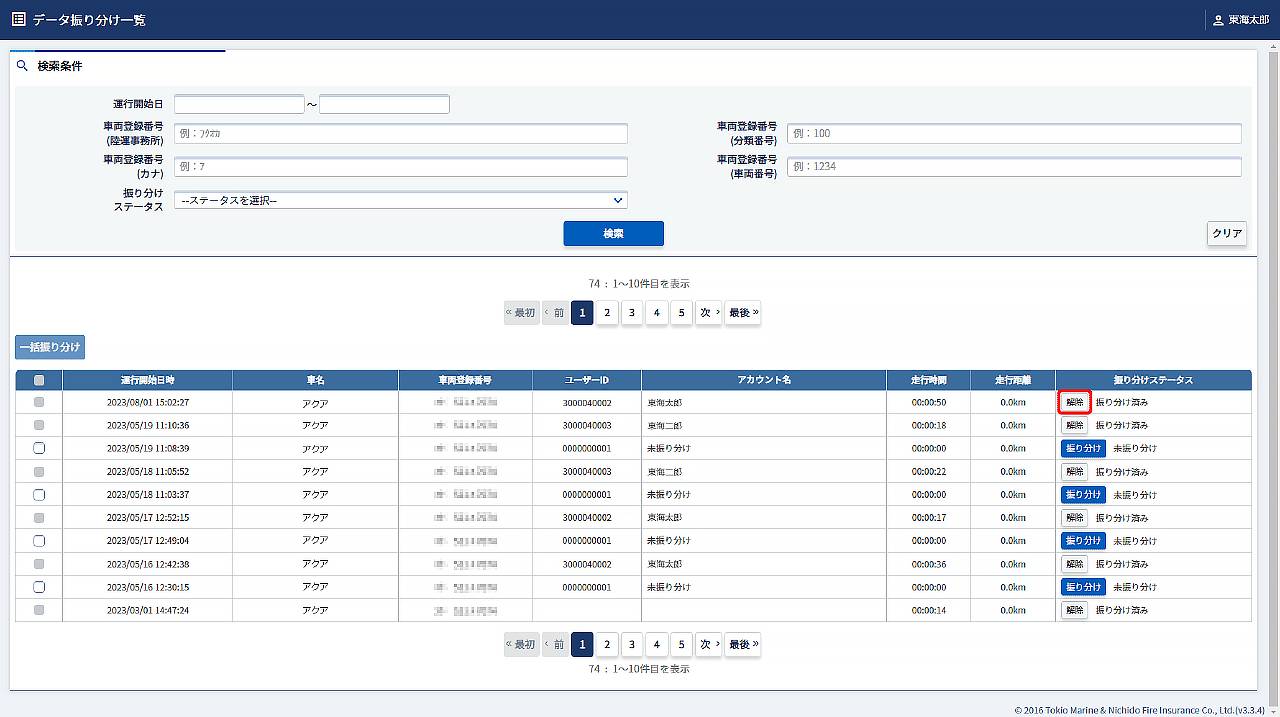解除したデータを再度ドライバーに振り分ける場合は走行データをドライバーに振り分けるを参照してください。