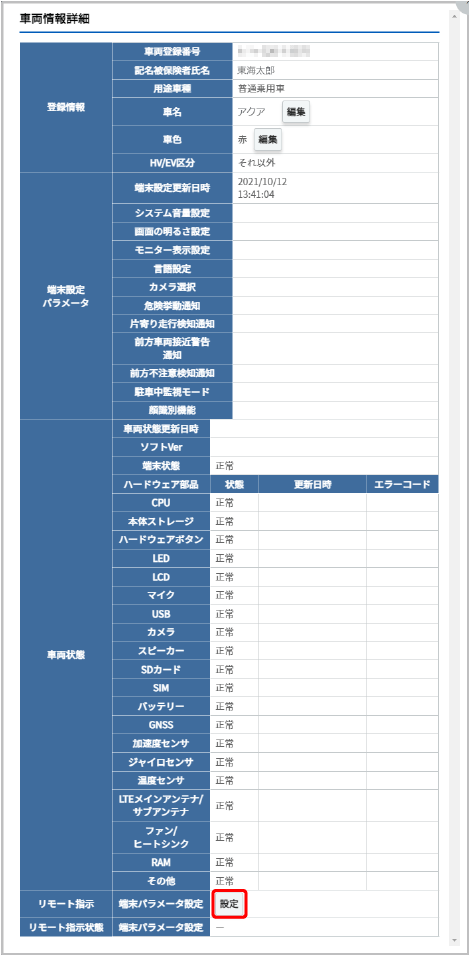 車両情報詳細画面(車両情報を編集する)で端末設定の【設定】をクリックします。