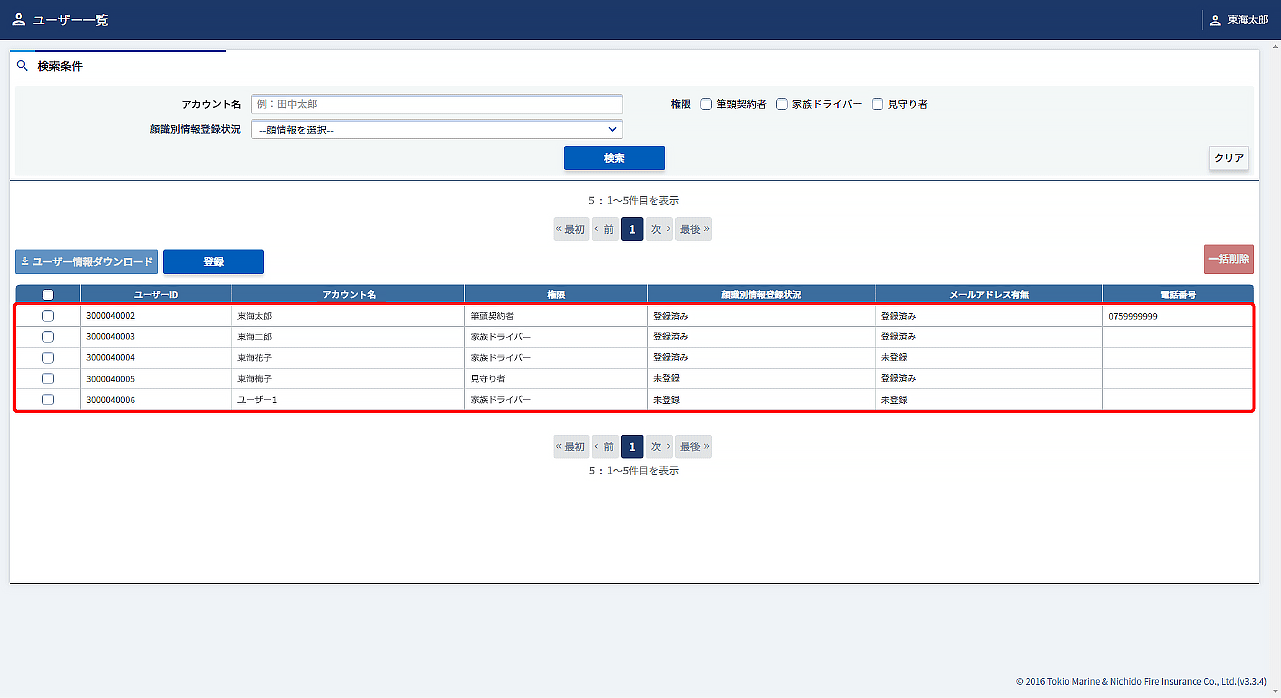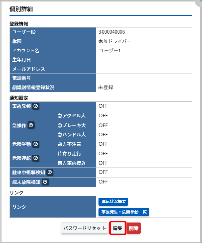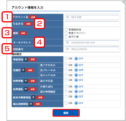 端末から登録した家族ドライバーアカウントは、WEBアプリでアカウント名とメールアドレスを登録する必要があります。