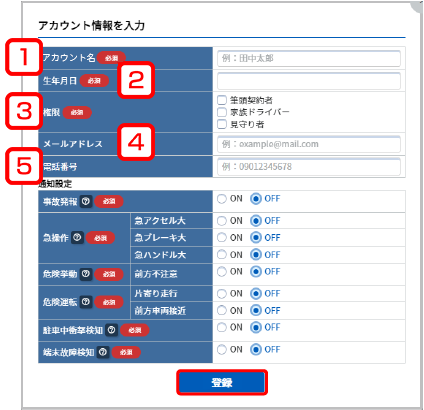 メールアドレス 事故や急操作などの通知メールの送信アドレスを入力* *: Gmailアドレスを登録すると、通知メールが届かない場合があります。