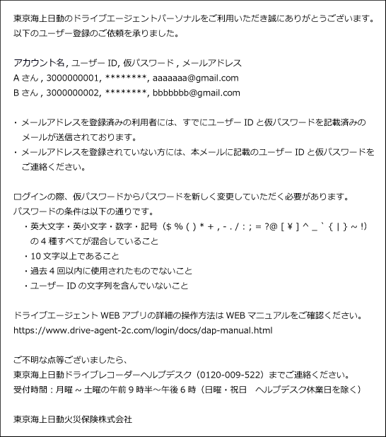 メールアドレスの登録がされていない家族ドライバー、見守り者へは、筆頭契約者からユーザーIDとパスワードをご連絡してください。