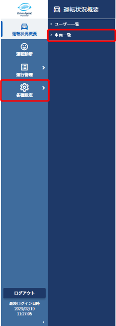 左メニューの【各種設定】の中の【車両一覧】をクリックします。