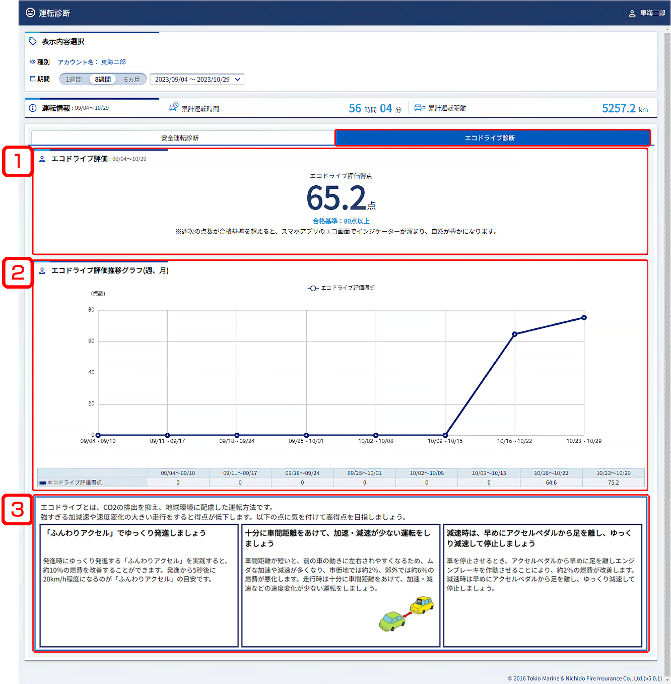運転診断画面(運転診断画面を表示する)で【エコドライブ診断】のタブをクリックします。