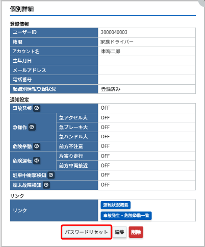 個別詳細画面(個別詳細画面を表示する)で【パスワードリセット】をクリックします。